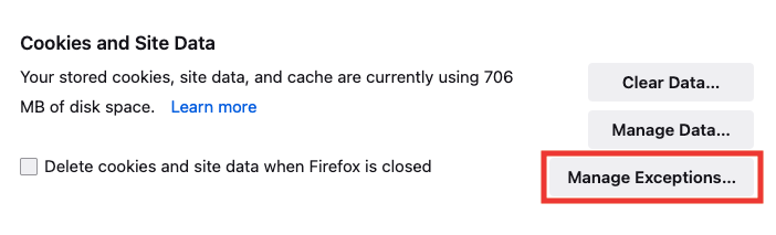 4. Scroll until you see Cookies and Site Data and then click on Manage Exceptions....