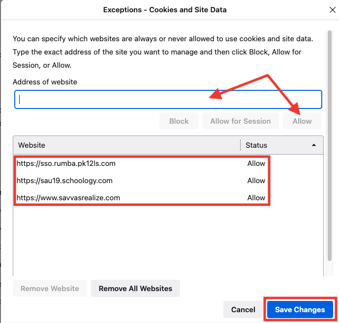 5. Enter the following websites one-by-one into the Address of website field and click on Allow. Once all websites are added, click on Save Changes.