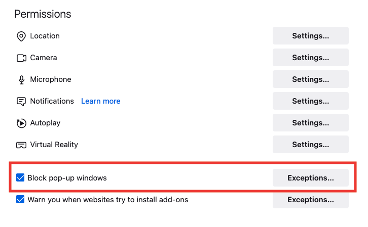 6. Go back to the Privacy & Security page and scroll down until you see Block pop-up windows and click on Exceptions.