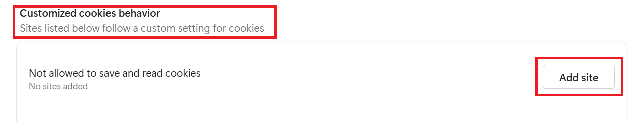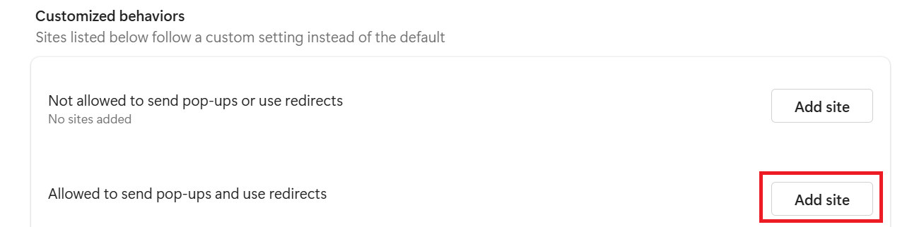 9. Under the Customized behaviors section, under Allowed to send pop-ups and use redirects, click Add site.