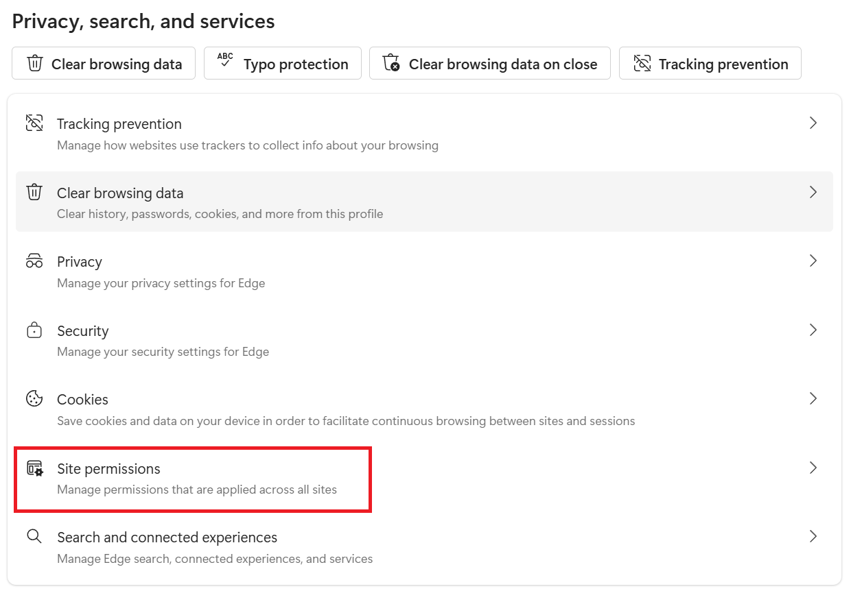 7. Go back to the Privacy, search, and services page and scroll down until you see Site permissions and click on it.