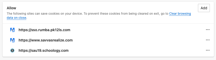The first thing to try is accessing Savvas from Schoology using a different browser. If not, you will need to enable some cookie settings and/or pop-up website settings. To do this, please follow the directions for the browser you are using. If your browser is not one of supported browser listed, you will need to locate and change the cookies permissions and pop-up exceptions on the browser you are using, similar to what is outlined below.