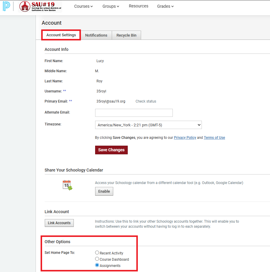 Schoology's will now default to a new Assignments tab when students log in instead of the Course Dashboard that it previously landed on. Although this cannot be changed by the district, students do have the ability to change their default landing page to Recent Activity, Course Dashboard, or Assignments. Please follow these instructions to change the default landing page: