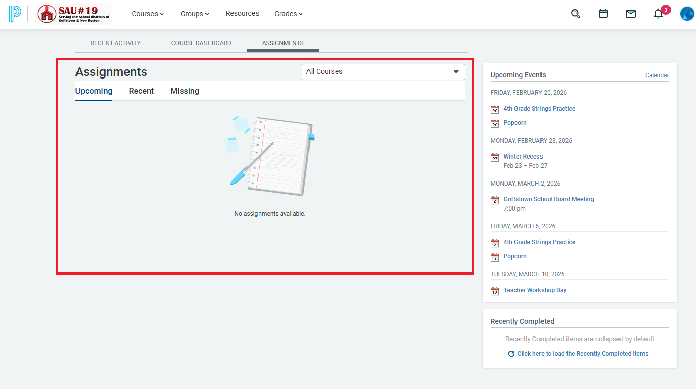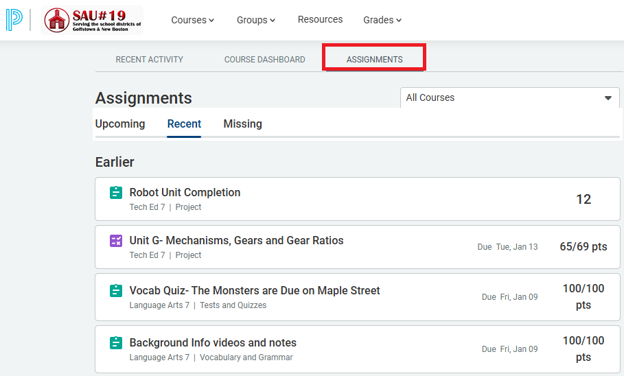 4. Once logged in, the default landing page will be the Assignments Page. For students in Middle or High School, this will have important information about your Upcoming, Recent, and Missing Assignments, as well as any Assignment Scores earned. If you click on an Assignment, it will take you directly to that Assignment.