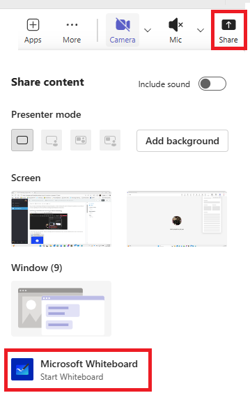 1. Select the Share icon and select Microsoft Whiteboard.
