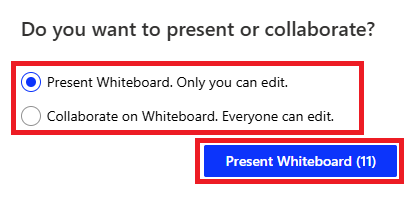2. Select either Present Whiteboard. Only you can edit or Collaborate on Whiteboard. Everyone can edit and then click Present Whiteboard.