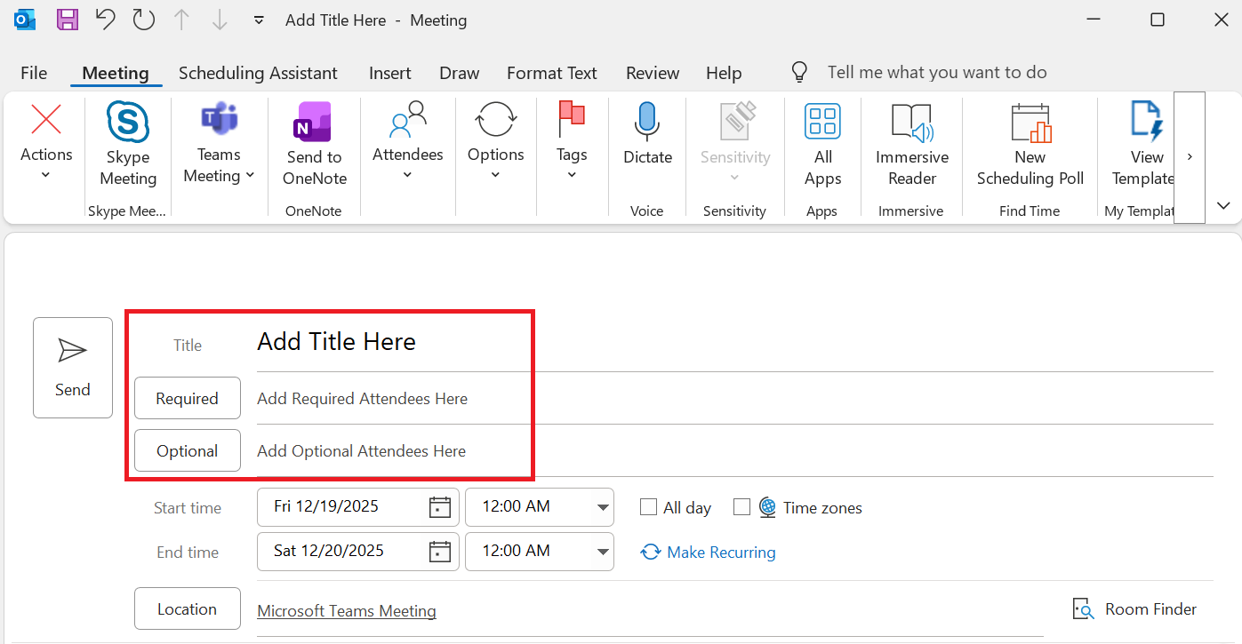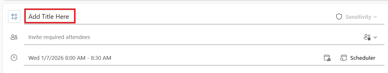 4. Add a title for your meeting and then click on Required or Optional to add required and/or optional attendees for the meeting.