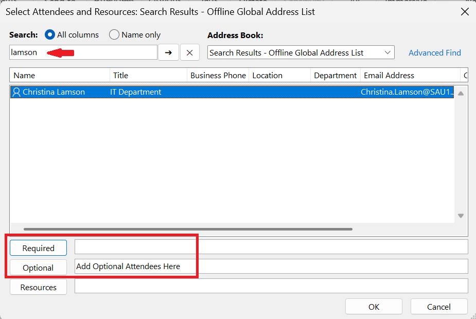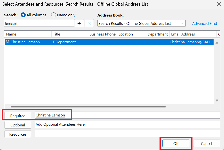 6. The name of the attendee is listed next to either Required or Optional. Repeat for any additional attendees and then click OK.
