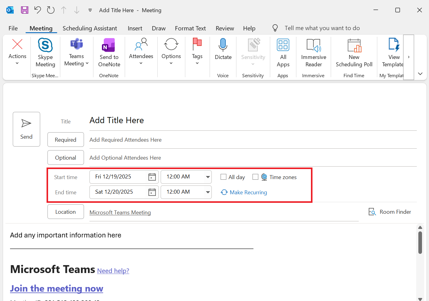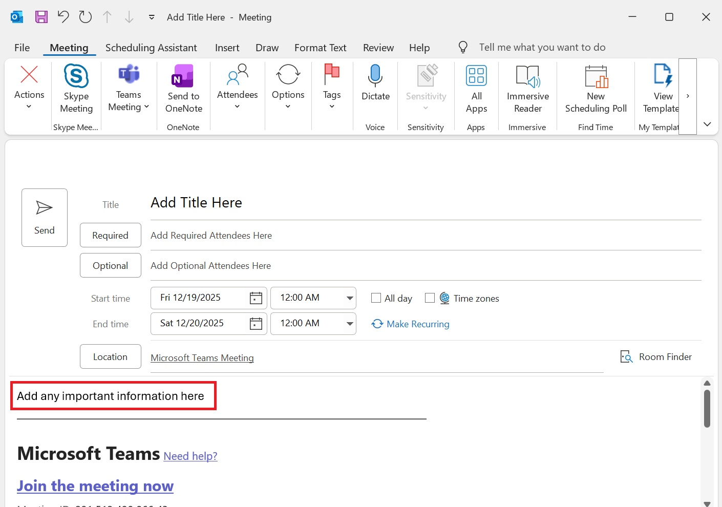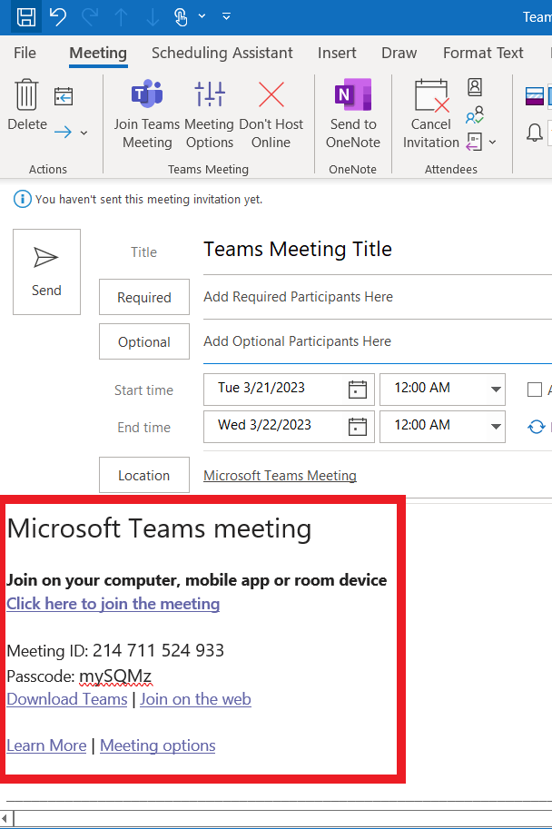 Please Note: You will not see the information for the Teams meeting in the text box yet.