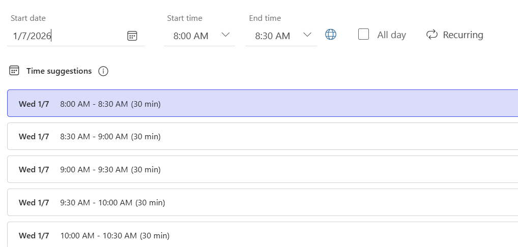 8. Select the time for the meeting by clicking on the time field and then selecting the desired time. You can manually adjust the time by clicking into the time boxes and typing the desired time as well.