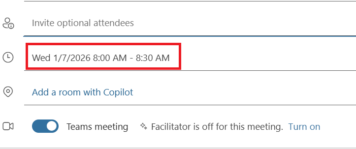 6. Select the time for the meeting by clicking on the time field and then selecting the desired time. You can manually adjust the time by clicking into the time boxes and typing the desired time as well.