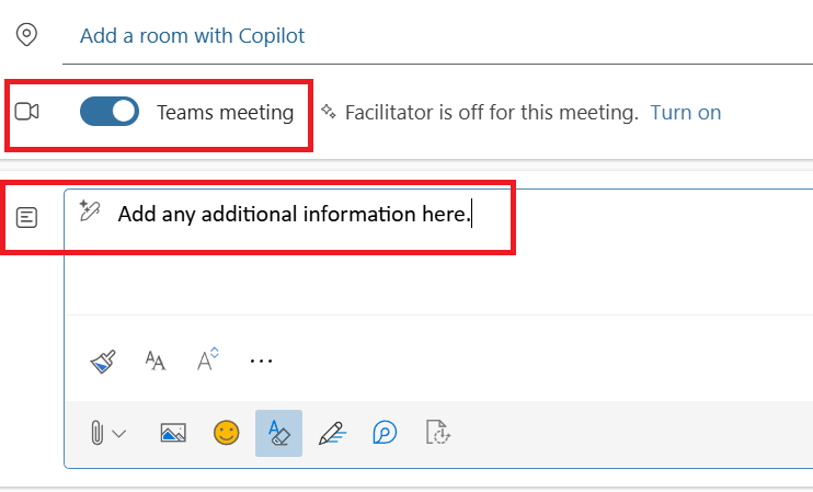 7. Toggle ON Teams meeting. Then add any additional information about the meeting into the text field.