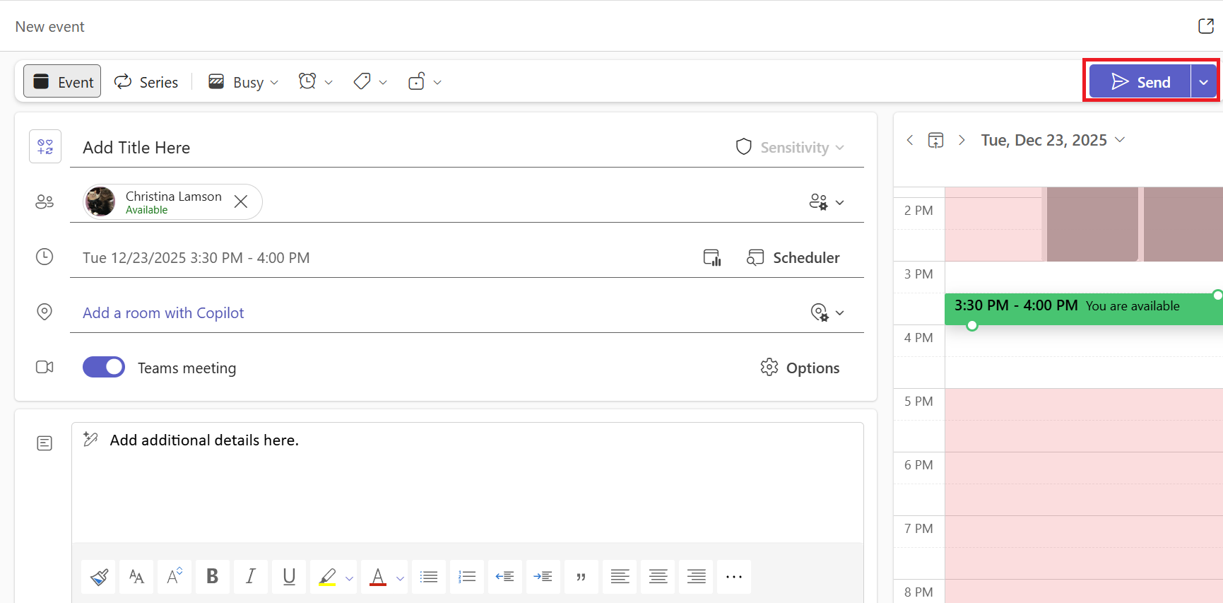 Please Note: You will not see the information for the Teams meeting in the text box yet.