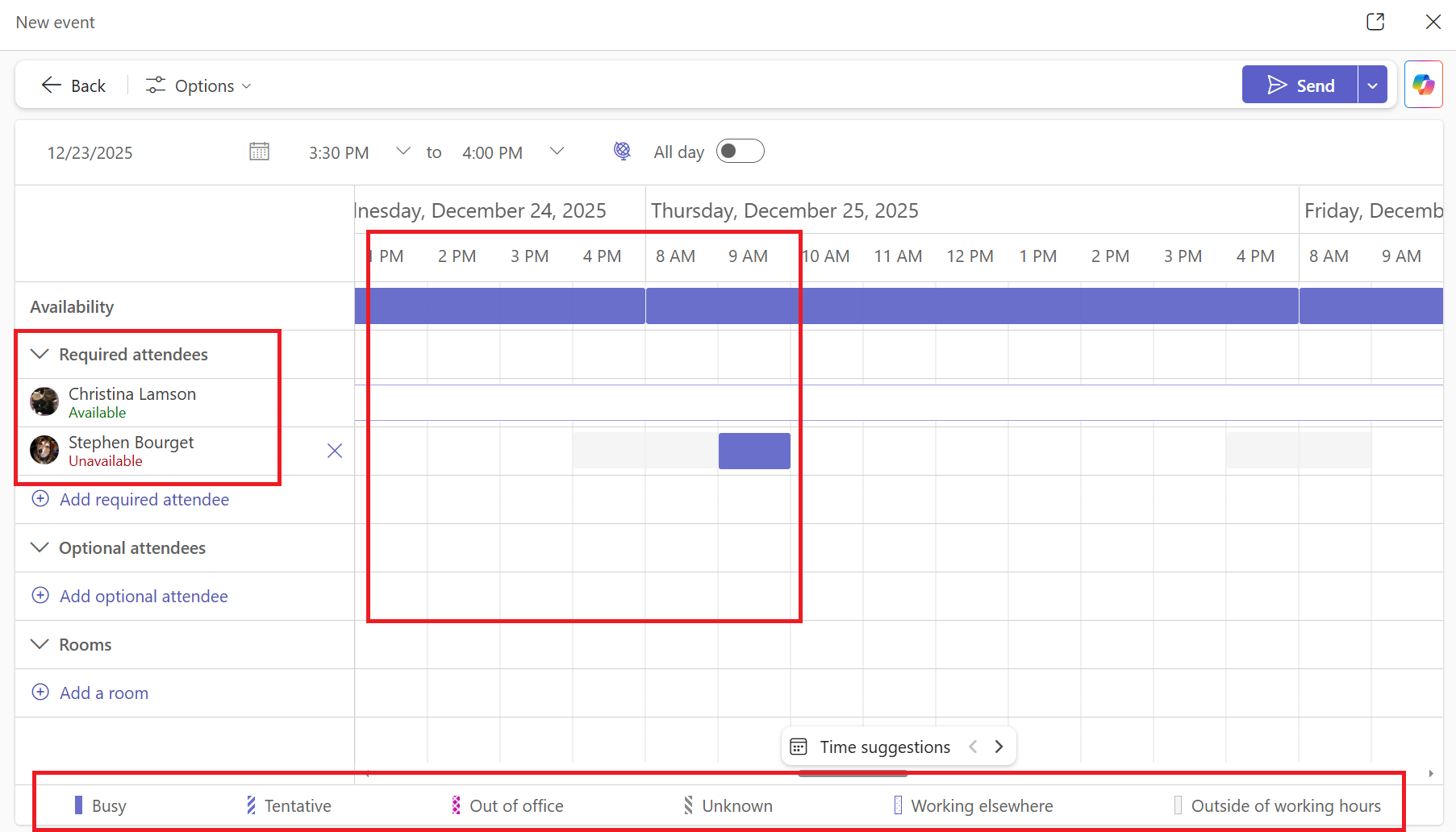 Add any required or optional attendees. And then check to see who is available on the calendar on the right. Use the key at the bottom of that screen to assist with understanding any color coding.