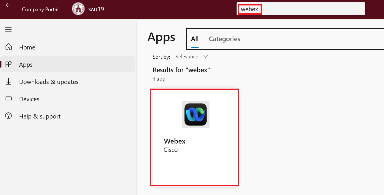 In the search field type webex and then click Enter. When the Webex app appears, click on it.