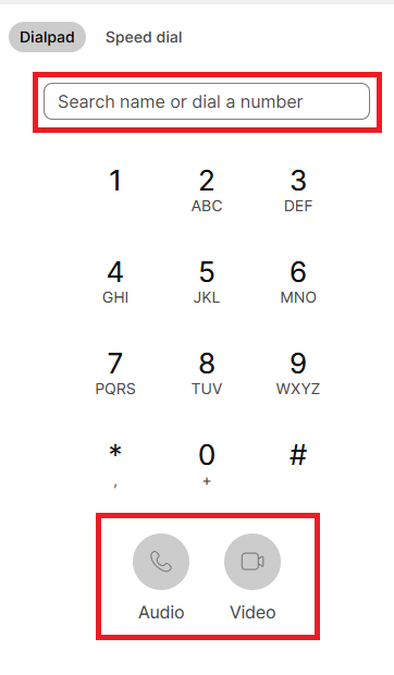 5. Enter the phone number of the person you want to call (including the area code). Then click Audio to make a voice call or Video to make a video call. If you are calling a staff member, you will need to enter the full phone number for that staff member, including the area code (this call will ring on both their computer and their room phone).
