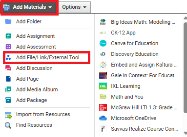 1. While on the Materials tab, click Add Materials and then select Add File/Link/External Tool from the drop-down menu.