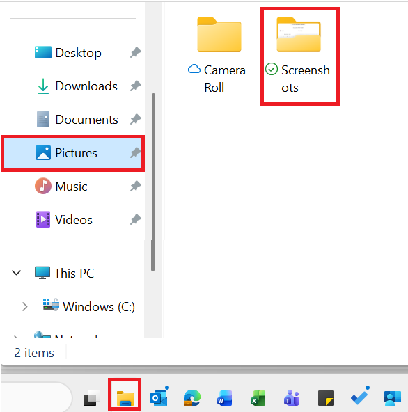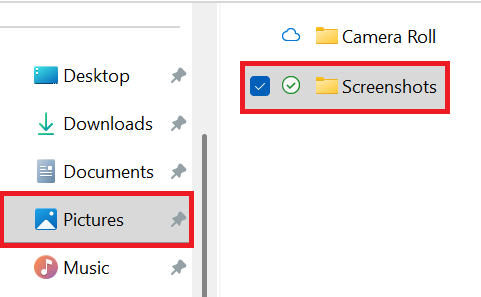 2. Click on the Pictures folder from either the left side bar and then click on the Screenshots folder.