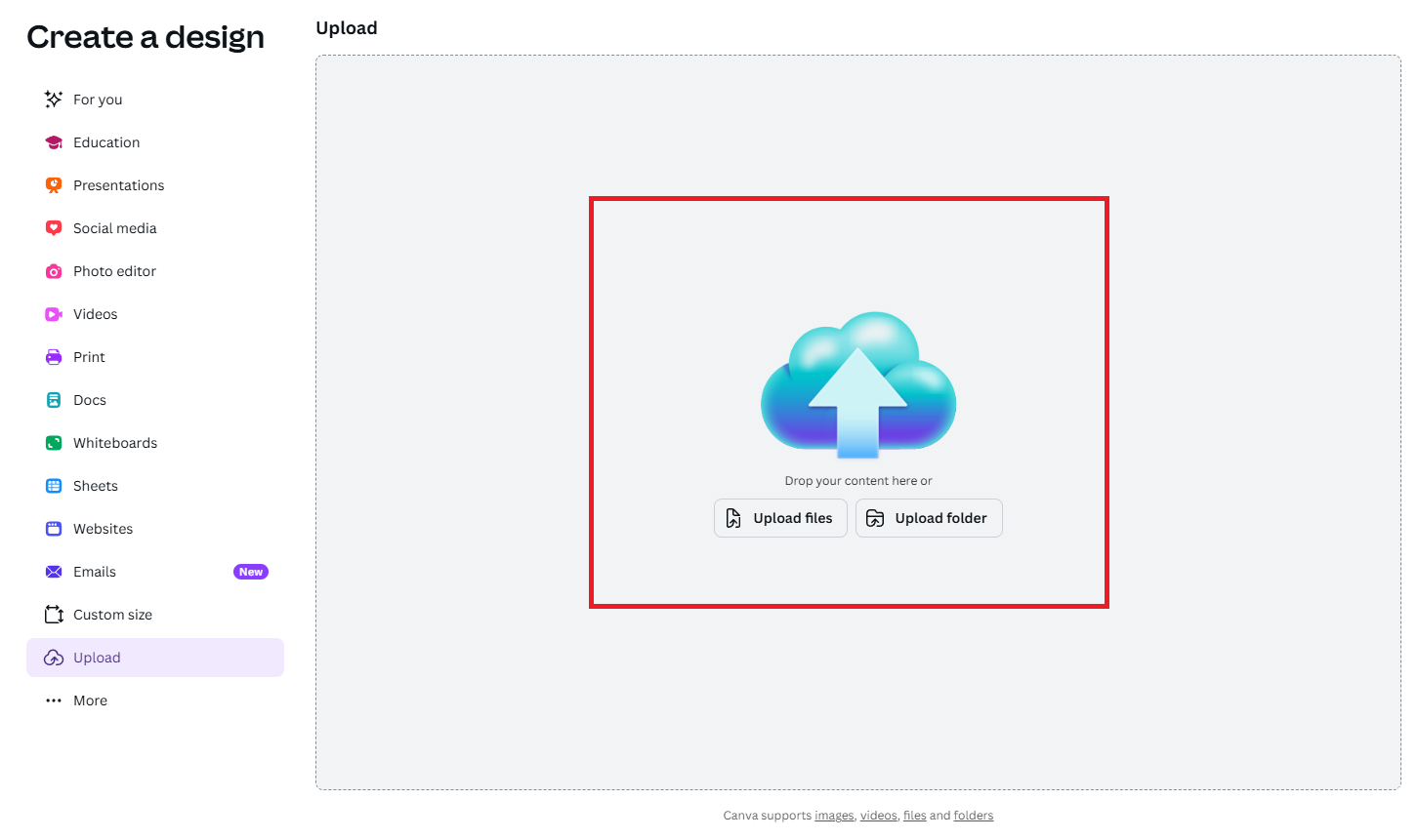 3. Drag your PDF into the Drop your contents here or box or click Upload files and select the PDF to upload.