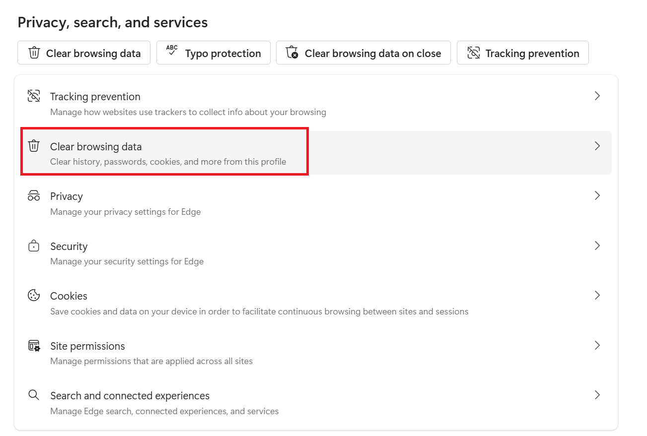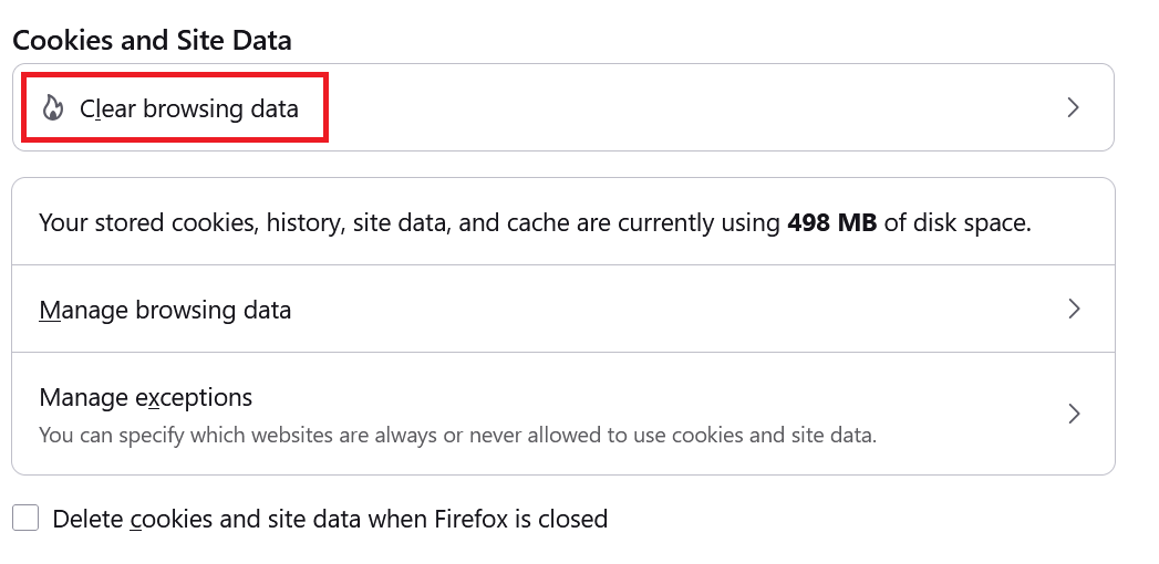 4. Scroll until you see Cookies and Site Data and click on Clear browsing data.