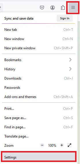 1. When in the Firefox browser, click on the menu icon (3 parallel lines) in the upper right-hand corner and choose Settings from the drop-down menu.