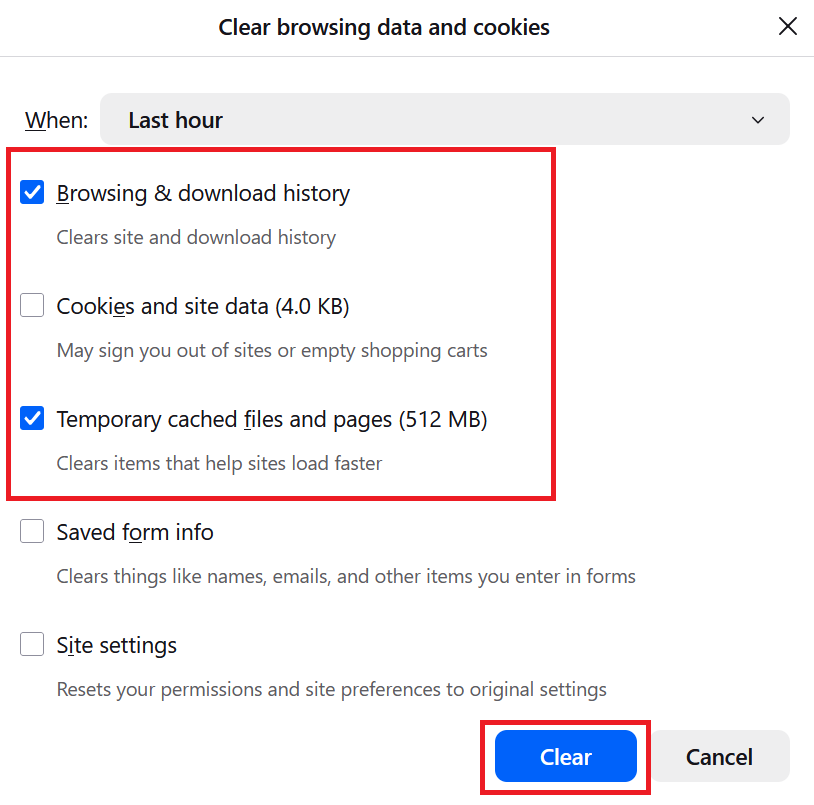 5. Uncheck Cookies and Site Data and select Browsing & download history as well as Temporary cached files and pages. You can choose to keep Cookies and site data checked if you want to clear that as well.