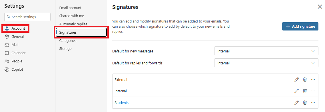 Outlook users can create an email signature that can be added automatically to all outgoing messages. Multiple signatures can be set up, allowing the user to switch between the signatures. To set up an email signature, please follow these directions:
