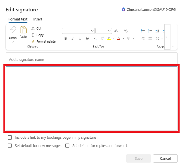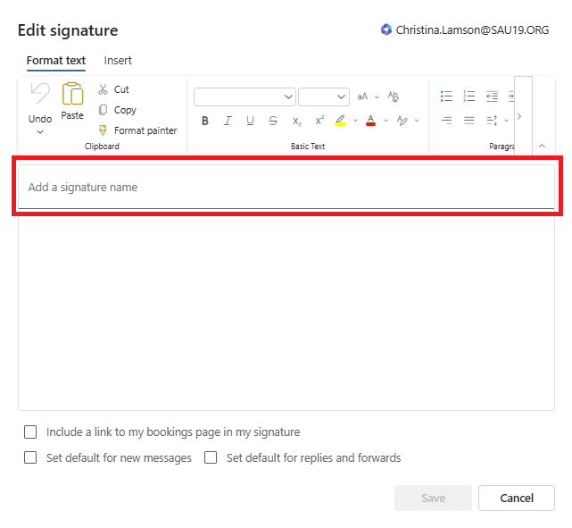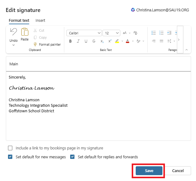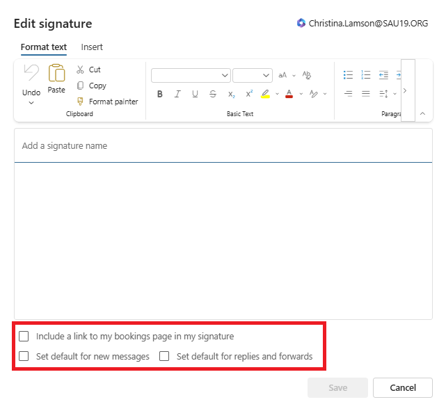6. If you have a personal bookings page (Book with Me) and you want a link to this Bookings page included in your signature, then click the box next to Include a link to my bookings page in my signature. Check the Set default for new messages if you want your signature to automatically be attached to new messages. Check the Set default for replies and forwards if you want your signature to automatically be applied to any email replies and forwarded messages. If you only have one signature set up, it will automatically default to this signature.