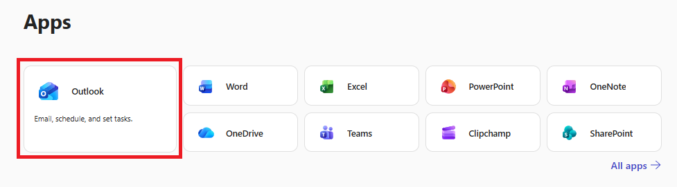4. Once in Microsoft 365, click on Outlook under the Apps section.