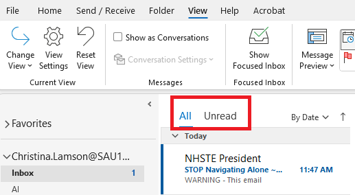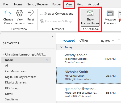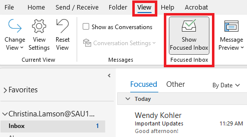 By default, Outlook will sort messages in Focused Inbox and Other. Focused emails are ones that Outlook determines may be important to you. Be aware, that if you rely on the Focused Inbox messages, you may miss out on some important emails. The Focused Inbox can be turned off so you can view all your messages in one place. Please follow these directions to turn off Focused Inbox: