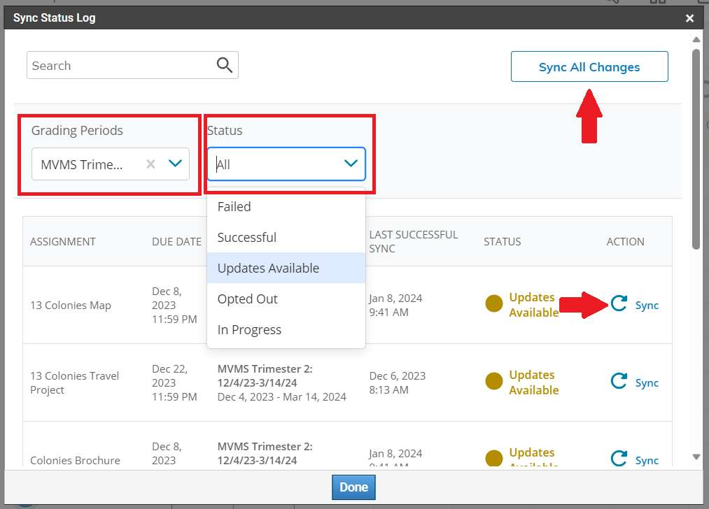 Please Note: The Sync All Changes does have some inconsistencies, therefore, syncing assignments individually has been more reliable.