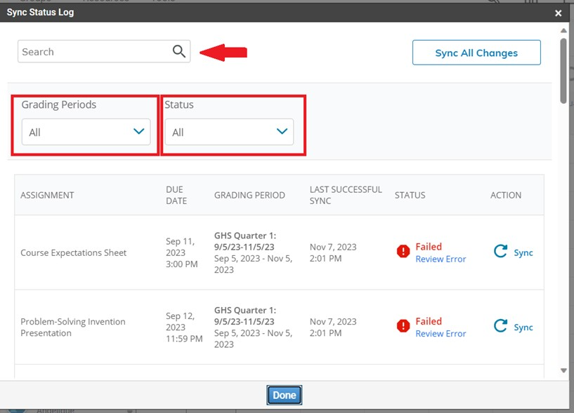 3. Click the Grading Periods drop-down menu and select the current grading period and then you can filter by Status. Sync Log filtering information can be located at the bottom of this article.