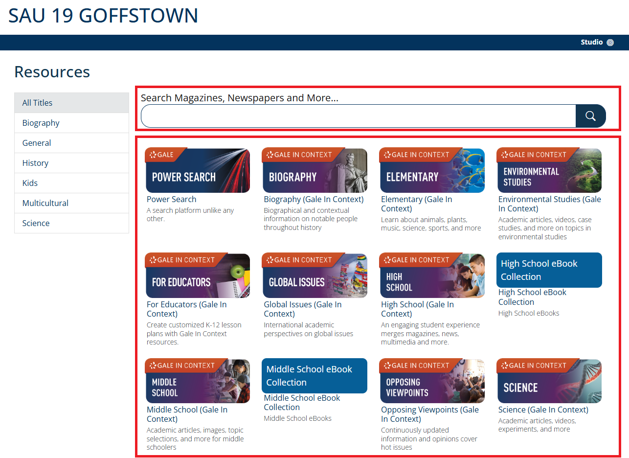 3. Click into the desired database to search for an article you want to link to your Schoology Course, or you can use the Search bar to search all databases at one.