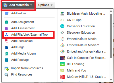 7. Go back to your Schoology Course and click on Add Materials. Then click Add File/Link/External Tool from the drop-down menu.