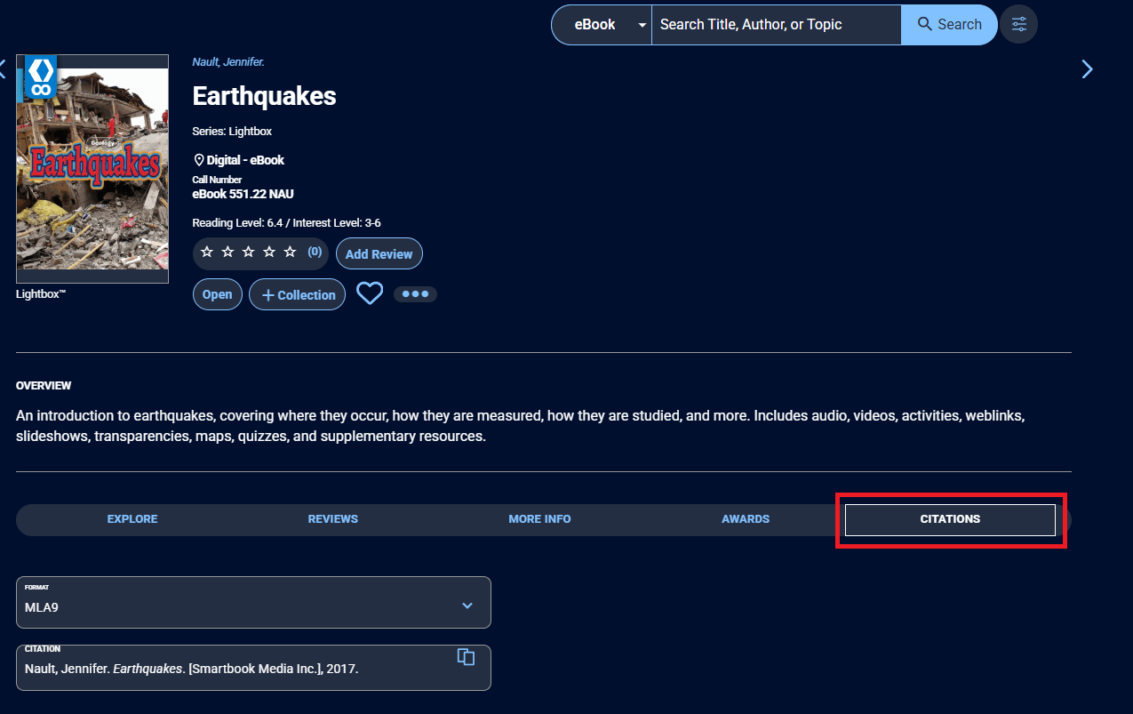 When you use information from an eBook in a project, essay, research paper, or other school assignment, you must cite the source. Follow the instructions below to do so: