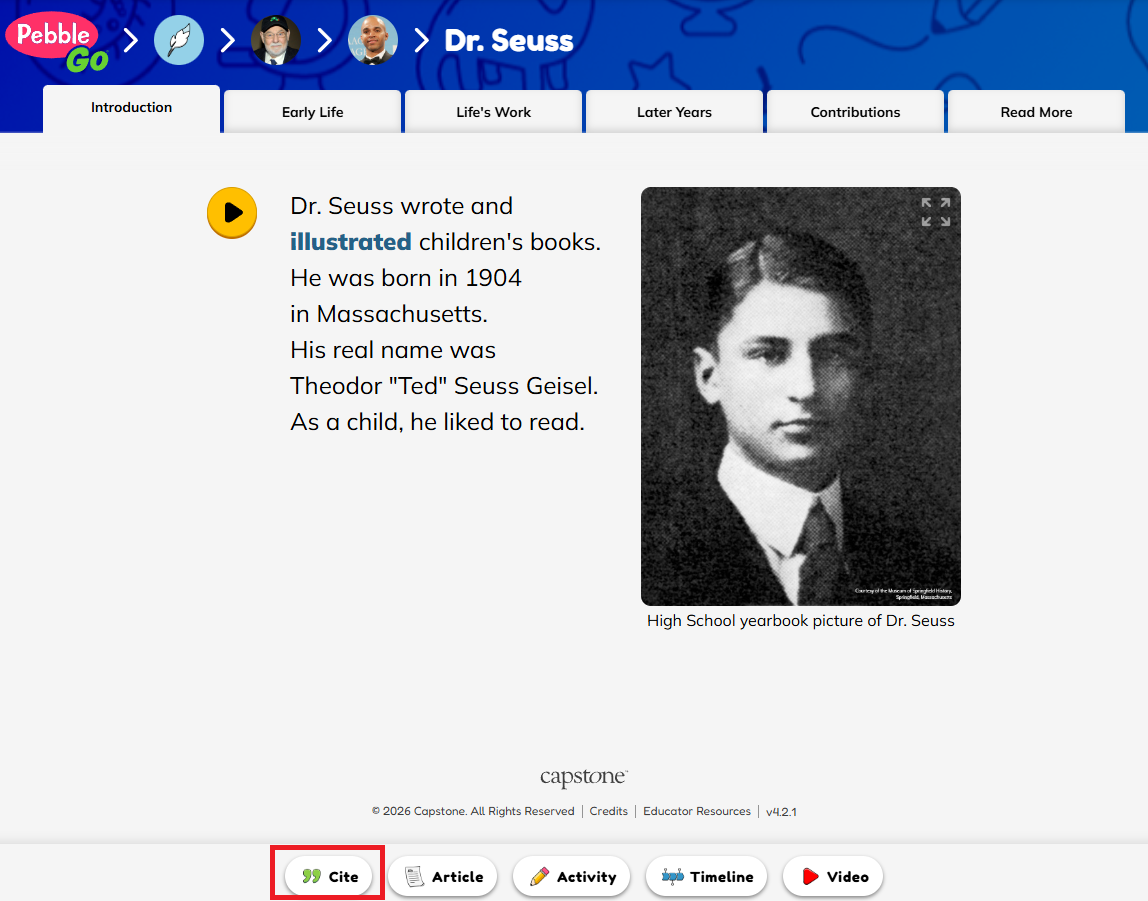 1. Open the PebbleGo/PebbleGo Next article you obtained information from.