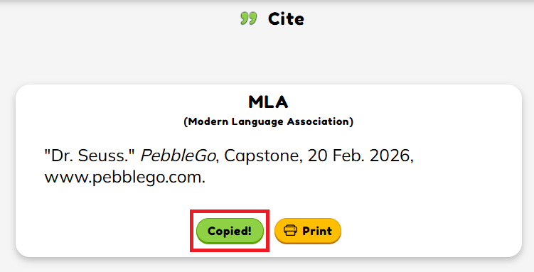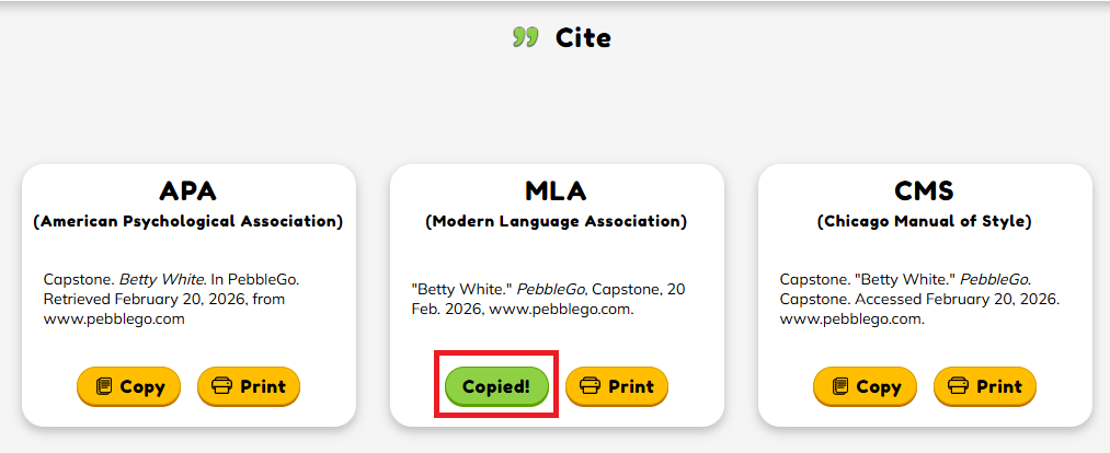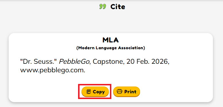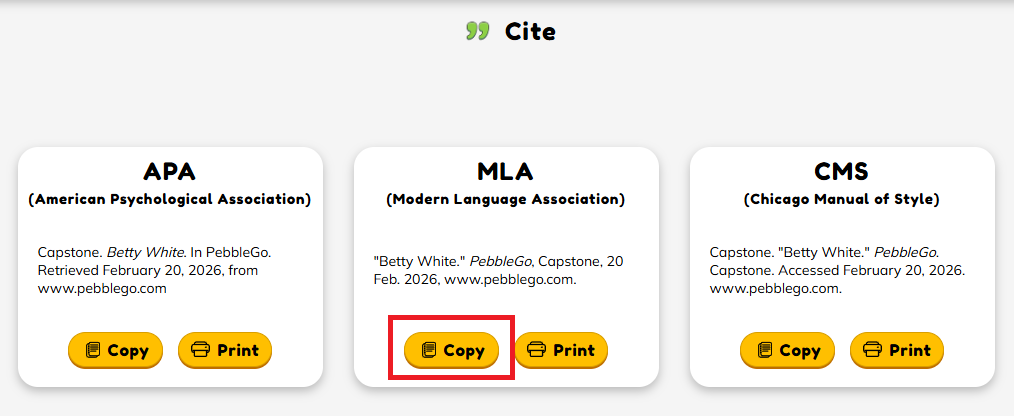 If you are citing an article from PebbleGo Next, you will be given a citation for APA, MLA, and CMS. Click Copy for the MLA citation.