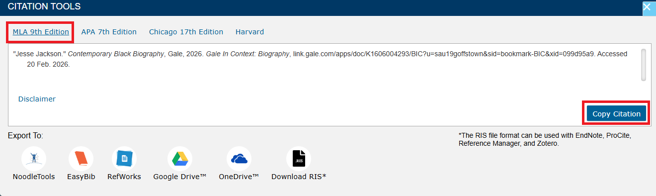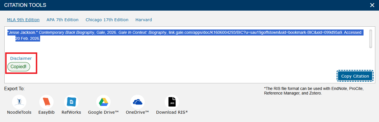 The citation will automatically be copied, and a disclaimer will appear stating it has been copied.