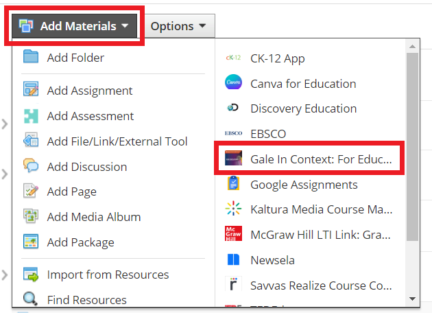 2. To add content as a Material within the Course, click on Add Materials and choose Gale in Context: For Educators from the right-hand side of the drop-down menu.