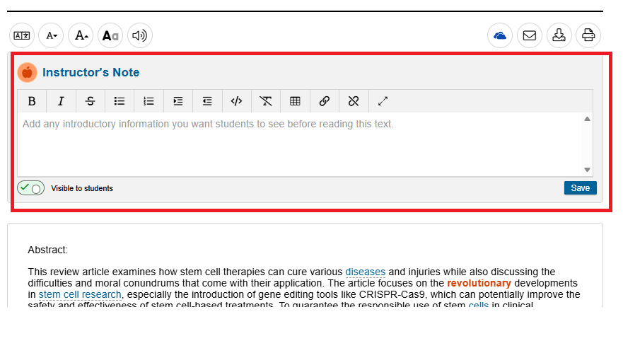 6. Once you locate an article you wish to use, you can add an instructor's note with directions or important information for your students. Click Save once you are done.