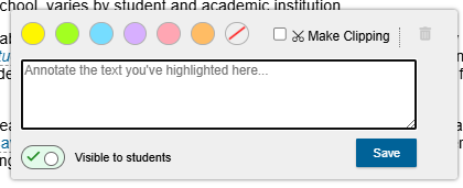 7. To annotate on selected text, highlight the desired text. Once the pop-up box appears, select the color for the highlight, enter the annotation into the text box, toggle on Visible to students, and click Save.