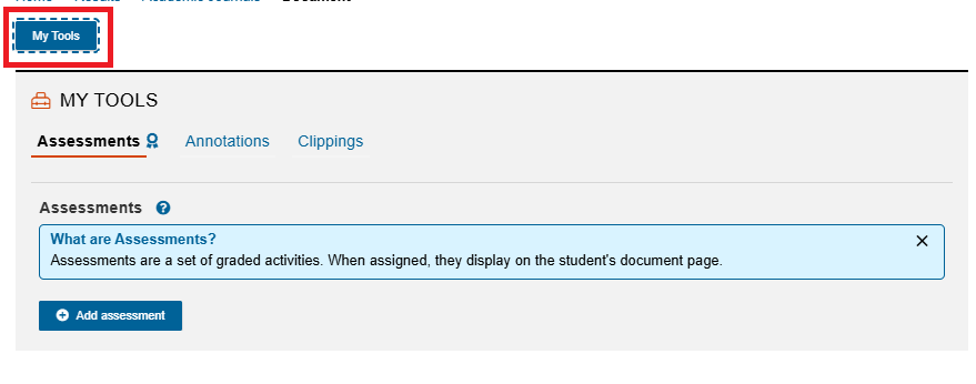 9. Click My Tools and have the ability to add assessment questions into the article or learn more about annotating or clipping article selections.