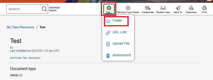 Please Note: Once you start customizing the article, you maybe prompted to save it to the Class Resources within a folder first. Click Add in the navigation menu and then click Folder. Once you complete this step, you will be able to continue customizing.