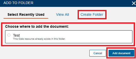 If you previously created a folder, you can select that folder or click Create Folder, name the new folder, and select it. Then click Add Document.