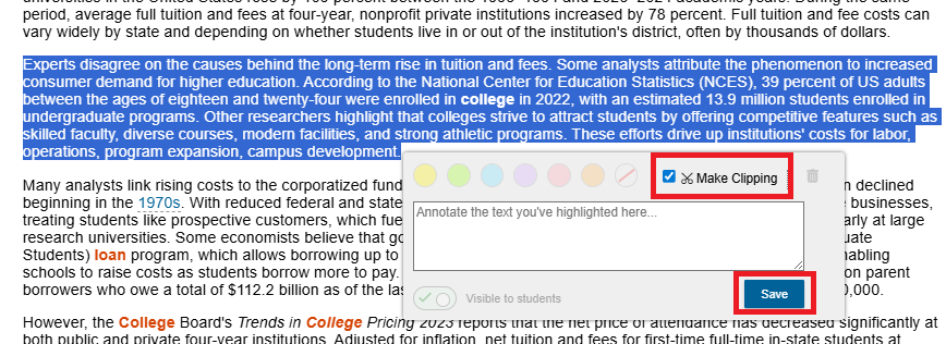 8. If you want students to only view a portion of an article, highlight the selection of the article desired, and when the pop-up window appears, check the box for Make Clipping and then click Save.