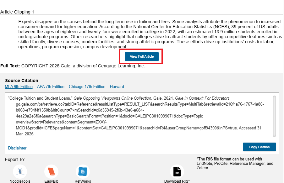 The student view will be limited to that clipping selection that you want them to focus on. If they want to see the full article, they can click View Full Article.