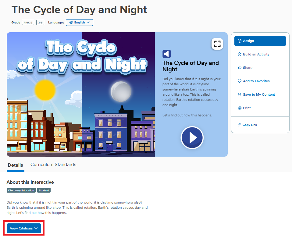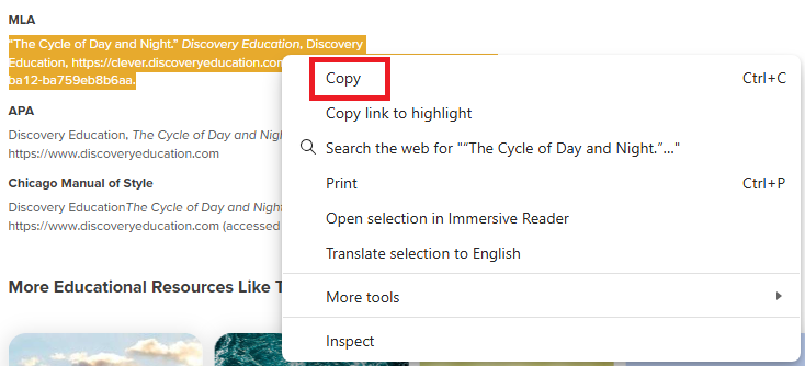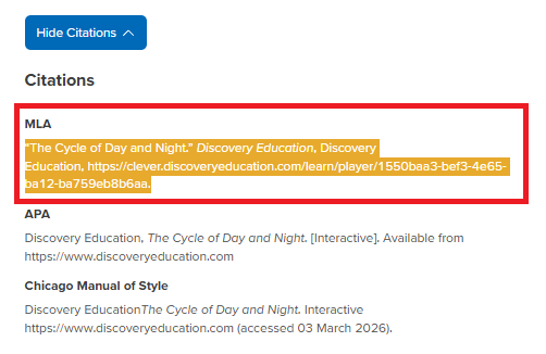All Discovery Education resources used must be properly cited, including videos, virtual field trips, audiobooks, games, and similar materials. To cite your source, please follow these instructions:
