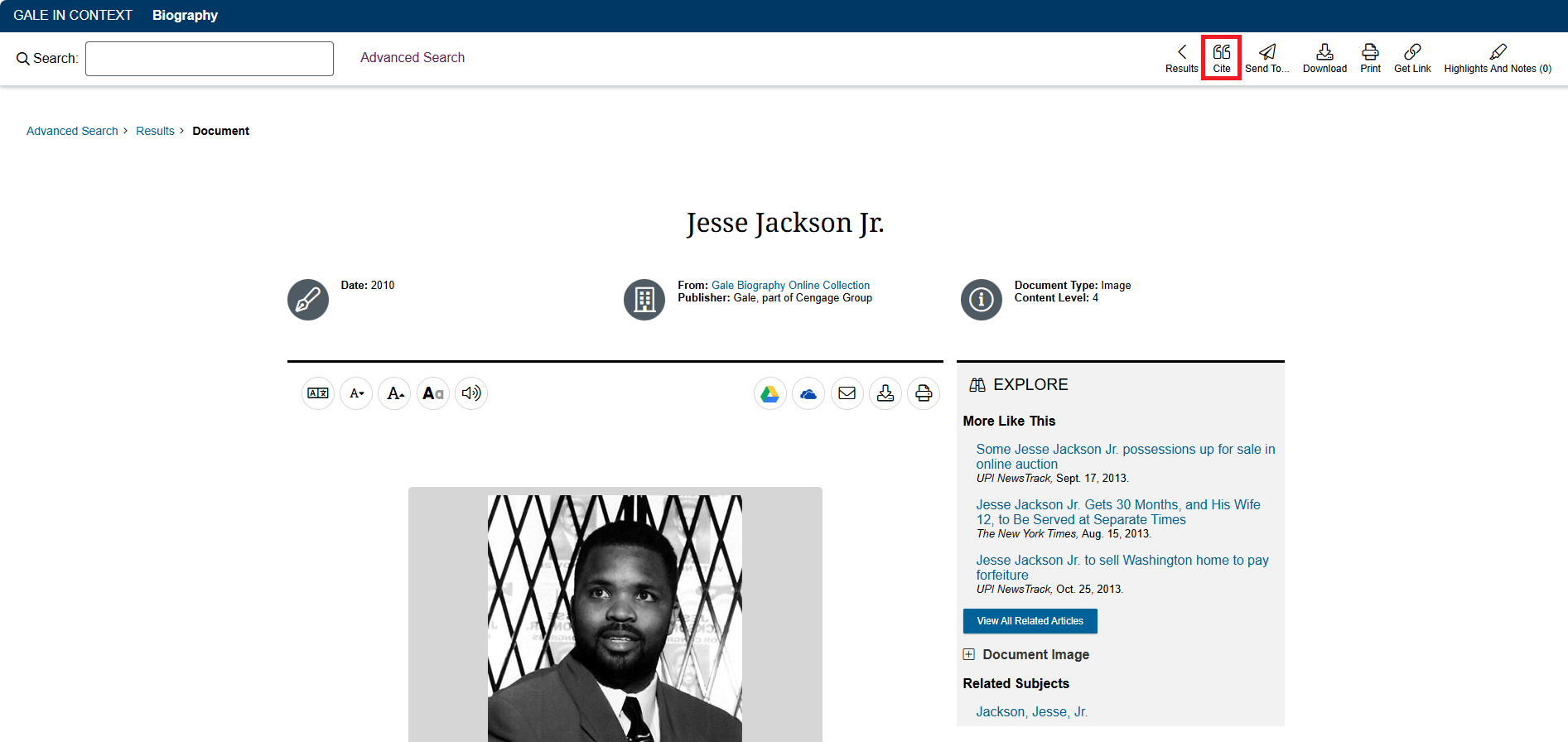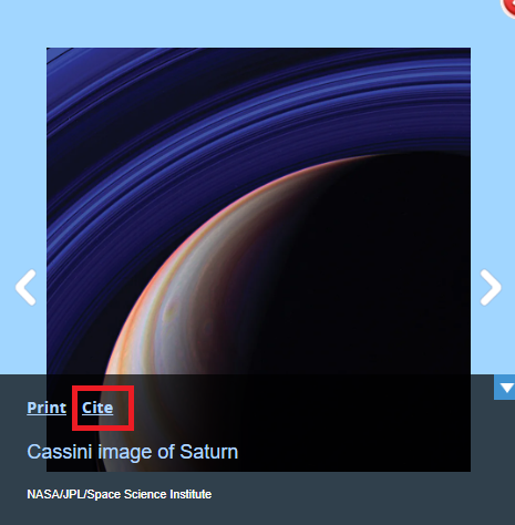2. The location of the citation will depend on the database you used and how you navigated to the image. If the image had icons in a text box next to it, click on the quotation marks icon to view the citations.