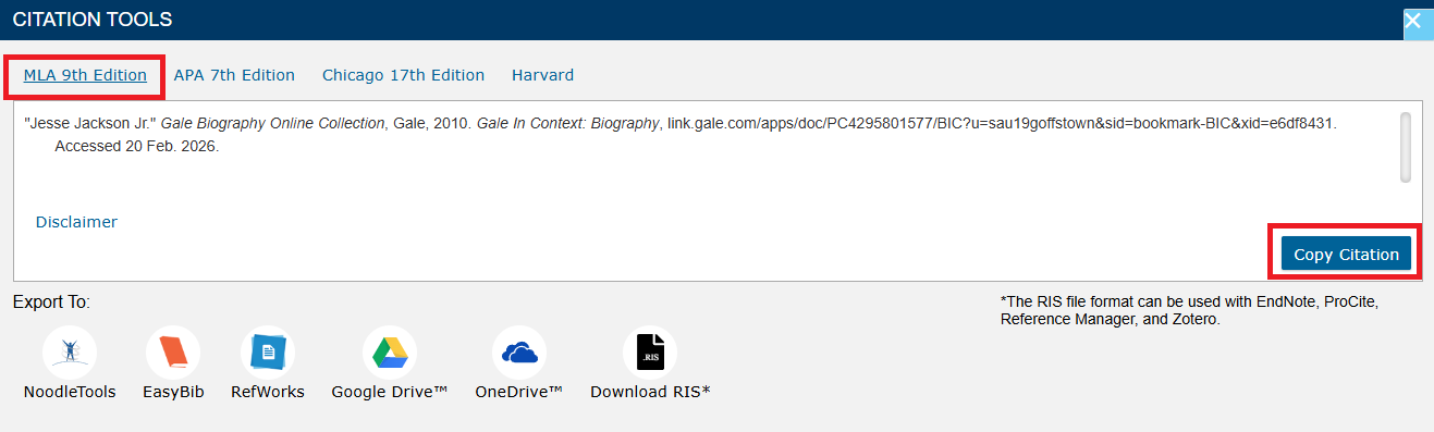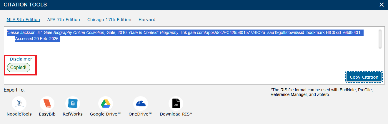 The citation will automatically be copied, and a disclaimer will appear stating it has been copied.