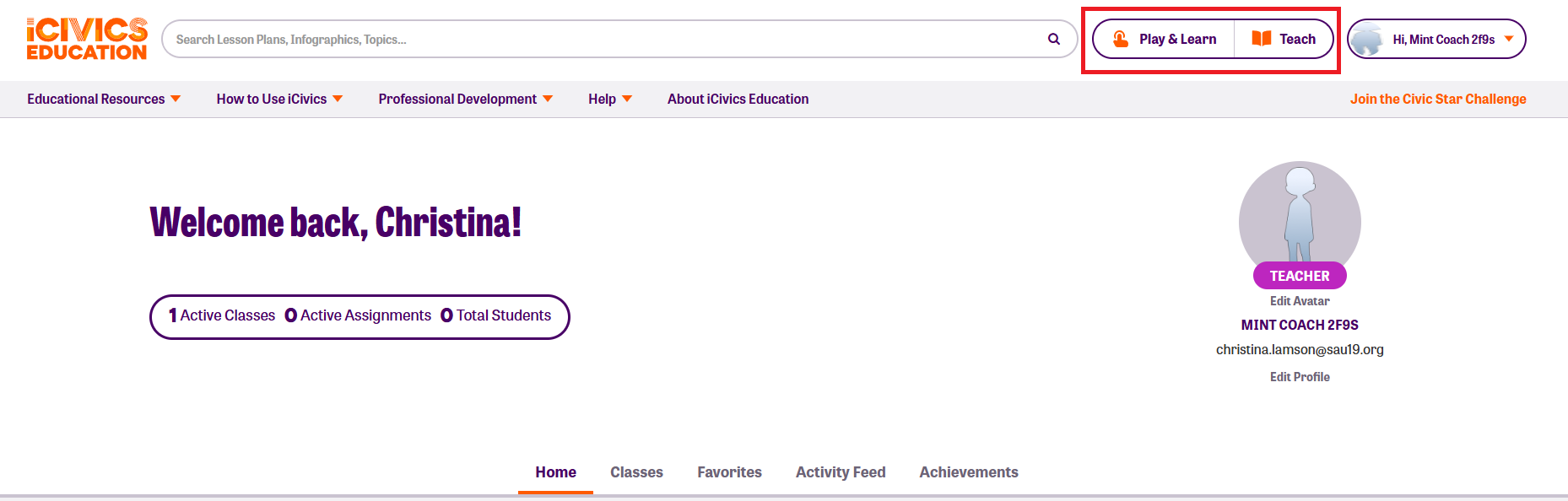 5. Once in the iCivics account, you can click on Play & Learn or Teach from the top navigation menu to explore materials.